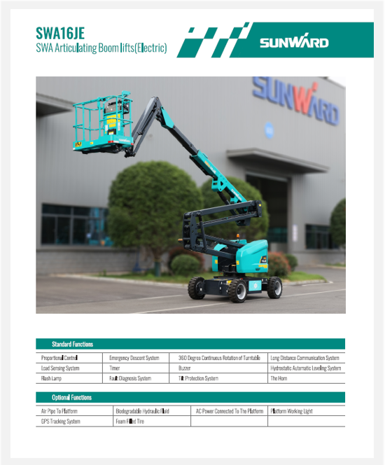 When it comes to choosing an articulated boom lift, the Sunward SWA 16JE is undoubtedly the smart choice. This versatile machine combines outstanding performance, superior safety features, and exceptional sustainability, making it the perfect tool for a wide range of applications.